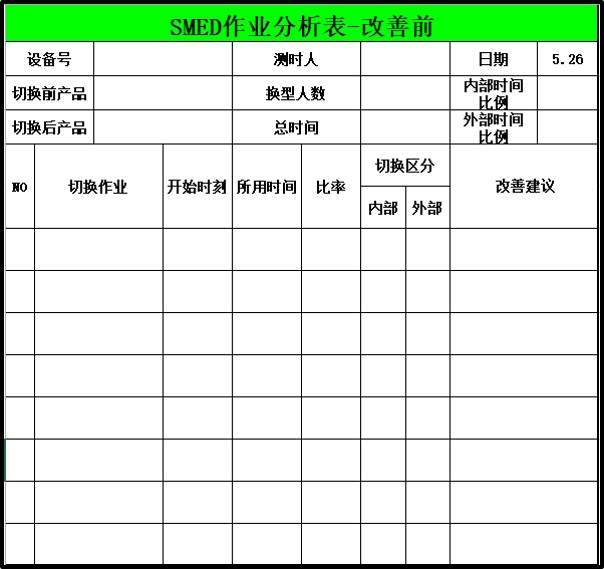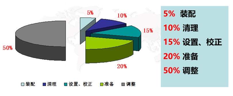 最初使用在汽車制造廠,以達到快速的模具切換(Exchange of Dies);豐田現(xiàn)場人員經(jīng)過長期探索,將沖壓工序沖床模具裝換調(diào)整所需時間,從1945年至1954年的3小時,縮短為1970年以后的3分鐘,現(xiàn)在,豐田汽車公司利用設(shè)備快速裝換調(diào)整SMED法,所有大中型設(shè)備的裝換調(diào)整作業(yè)均能在10分鐘之內(nèi)完成。企業(yè)產(chǎn)品切換時間由4小時縮短為3分鐘。