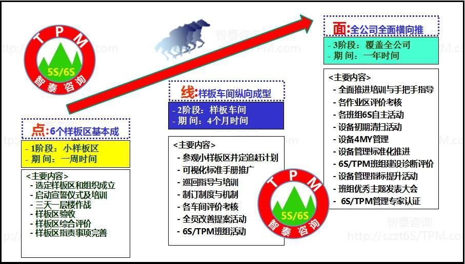 咨詢(xún)公司在推進(jìn)6S管理一般是先從點(diǎn)、線(xiàn)、面這種方式進(jìn)行。點(diǎn)就是先做好樣板區(qū)形成標(biāo)準(zhǔn);線(xiàn)就是縱向推進(jìn)至整個(gè)車(chē)間形成制度;面就是橫向推進(jìn)至全公司形成文化。