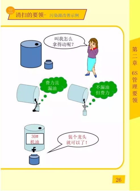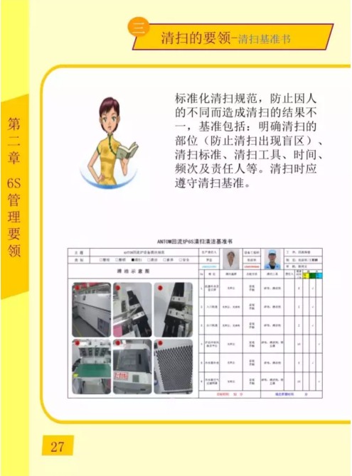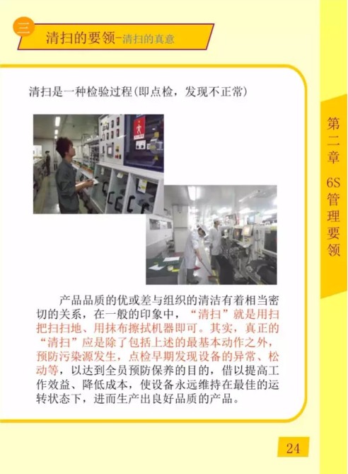 產(chǎn)品品質(zhì)的優(yōu)或差與組織的清潔有著相當(dāng)密切的關(guān)系,在一般的印象中,“清掃”就是用掃把掃掃地、用抹布接試機(jī)器即可。其實(shí),真正的“清掃”應(yīng)是除了包括上述的最基本動(dòng)作之外,預(yù)防污染源發(fā)生,點(diǎn)檢早期發(fā)現(xiàn)設(shè)備的異常、松動(dòng)等,以達(dá)到全員預(yù)防保養(yǎng)的目的,借以提高工作效益、降低成本,使設(shè)備永遠(yuǎn)維持在最佳的運(yùn)轉(zhuǎn)狀態(tài)下,進(jìn)而生產(chǎn)出良好品質(zhì)的產(chǎn)品。