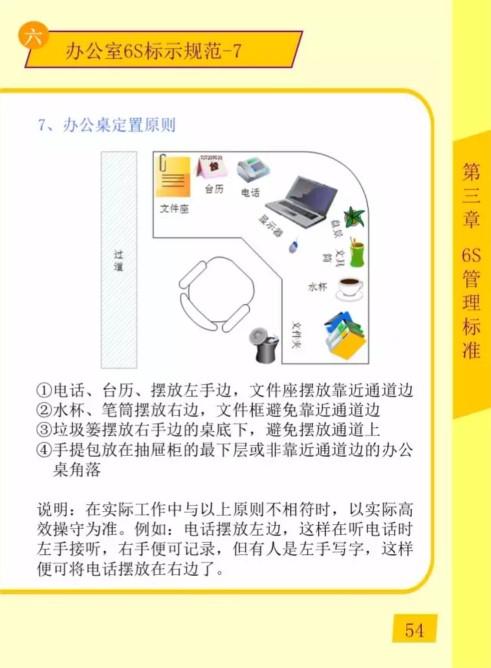說明:在實際工作中與以上原則不相符時,以實際高效操守為準。例如:電話擺放左邊,這樣在聽電話時左手接聽,右手便可記錄,但有人是左手寫字,這樣便可將電話擺放在右邊了。