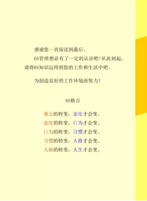 6S管理之素養(yǎng)的要領:1.摒棄工作方面的傳統(tǒng)思維方式;2.不要試圖辯解,應尋求解決的方法;3.首先,從否定性觀點分析工作現(xiàn)場......