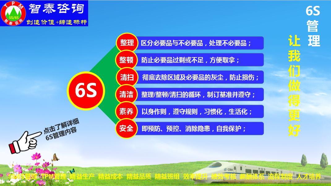 智泰咨詢下屬的5S管理公司首創(chuàng)的產(chǎn)品三天一標桿,三天一條線,三天締造6~8個標桿車間,智泰咨詢專業(yè)的顧問團隊為企業(yè)的5S管理快速打造已形成一套標準化內(nèi)容。