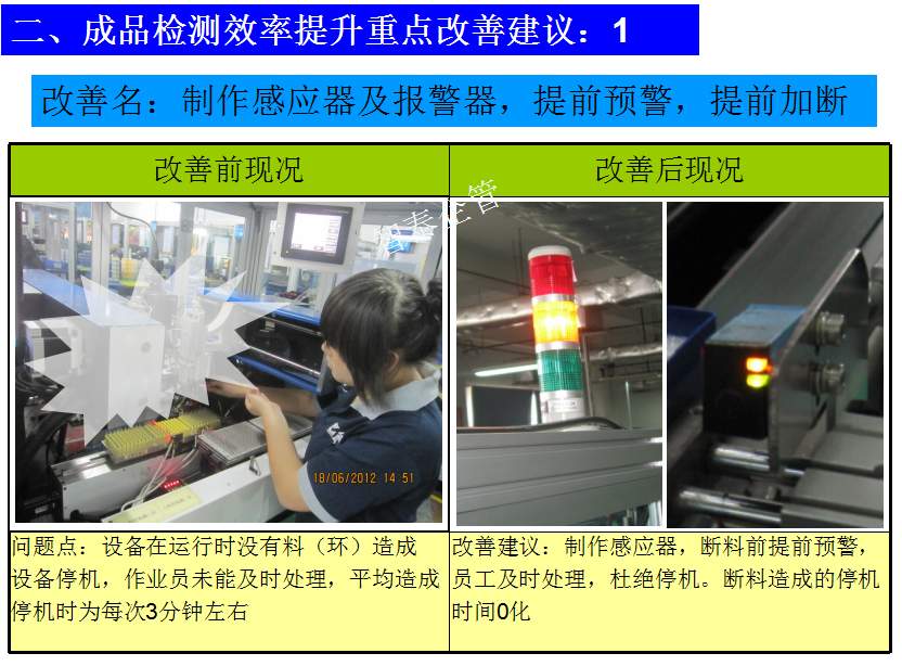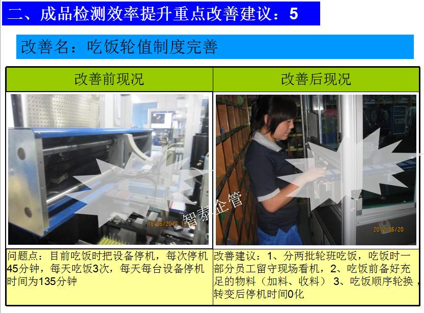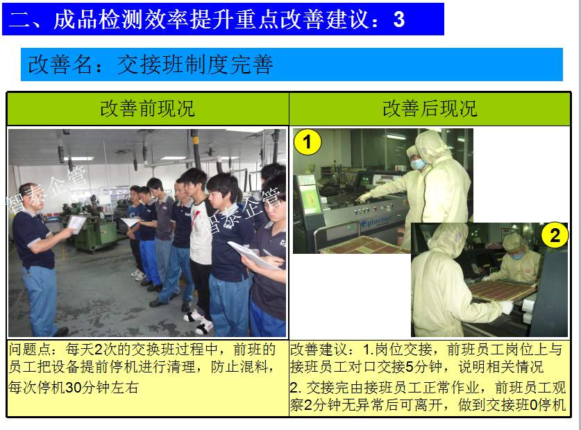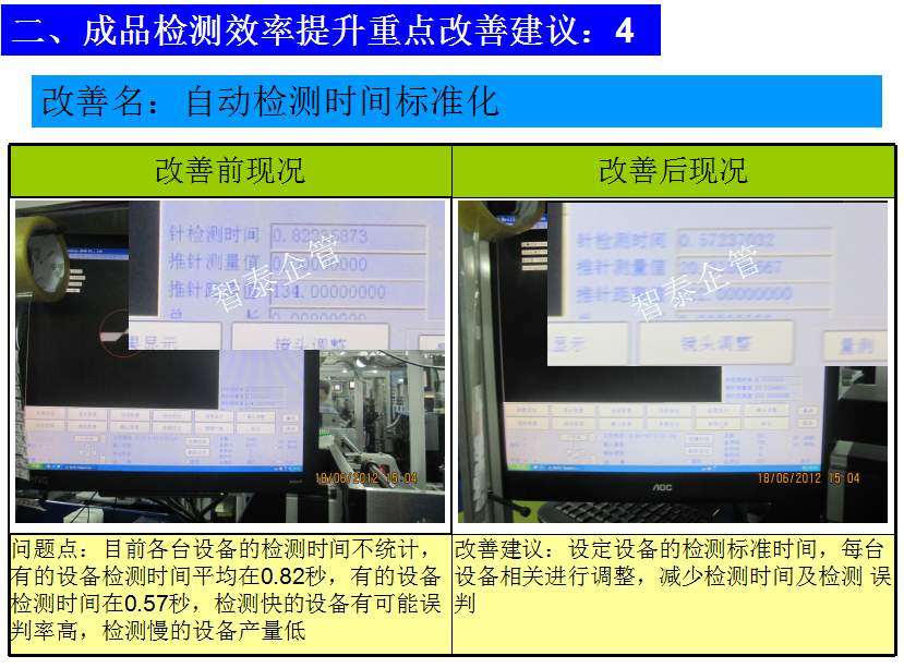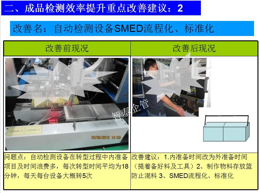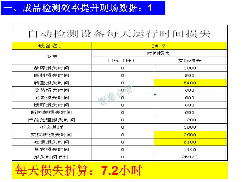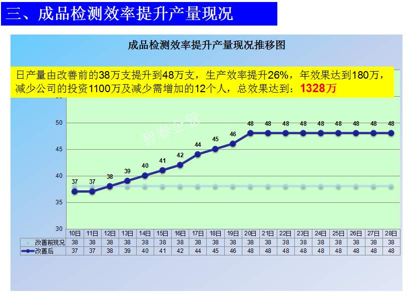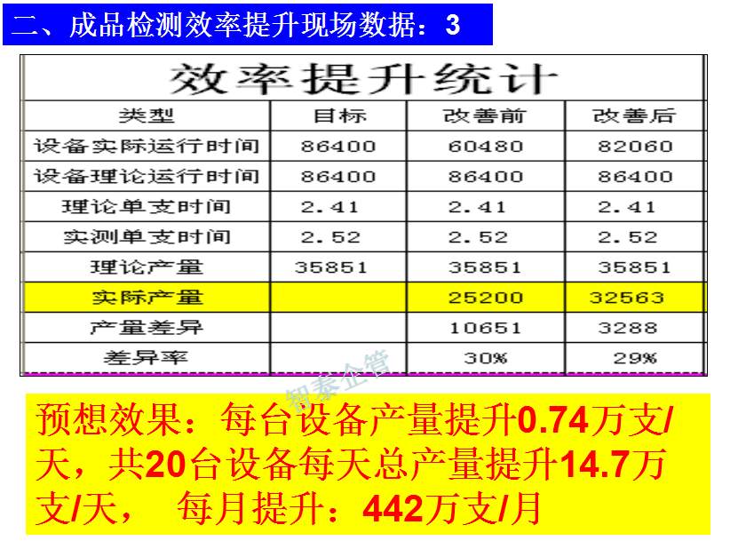 世界級(jí)制造及精益管理是智泰人一生追求的理想,智泰咨詢?cè)谄髽I(yè)推進(jìn)精益生產(chǎn)后平均生產(chǎn)效率提升35%以上,智泰專業(yè)團(tuán)隊(duì)為企業(yè)消除八大浪費(fèi),通過精益管理,提高企業(yè)的生產(chǎn)效率和產(chǎn)品質(zhì)量,持續(xù)推進(jìn)焦點(diǎn)課題改進(jìn)重大問題,每年給企業(yè)帶來的收益平均有800萬以上,附件為智泰咨詢顧問團(tuán)隊(duì)為某企業(yè)生產(chǎn)效率提升的案例,請(qǐng)查閱: