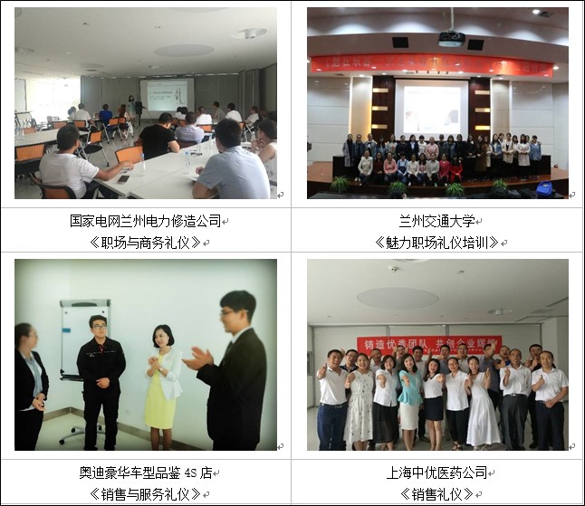 曾為政府、電力、金融、汽車、通訊、建筑等多個(gè)領(lǐng)域企業(yè)/院校進(jìn)行過禮儀形象課程培訓(xùn),培訓(xùn)對(duì)象涵蓋政府政務(wù)人員、企事業(yè)單位新入職員工、教師隊(duì)伍、醫(yī)療行業(yè)、企業(yè)中層管理者、基層管理者和高層領(lǐng)導(dǎo)等各個(gè)層次,至今排課近300場(chǎng),累計(jì)學(xué)員10000余人,學(xué)員好評(píng)率高達(dá)98%。