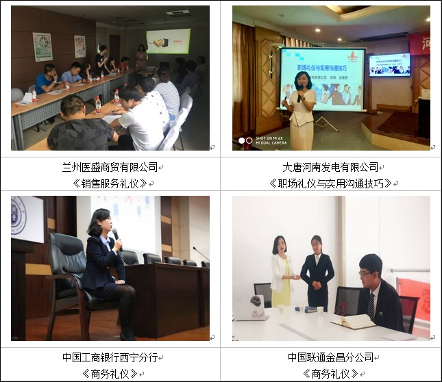 ● 曾為蘭州交通大學(xué),進(jìn)行了16期《職業(yè)素養(yǎng)與禮儀》課程培訓(xùn),并在一年內(nèi)開展了近30場(chǎng)禮儀培訓(xùn)講座,授課人次高達(dá)1000多人。課程內(nèi)容結(jié)合我國(guó)禮儀文化與當(dāng)代禮儀現(xiàn)狀,傳授禮儀知識(shí)和操作技能,讓學(xué)員真正了解“禮”和“儀”在職場(chǎng)中的關(guān)鍵性作用,促使學(xué)員對(duì)自身氣質(zhì)、風(fēng)度、言行舉止有了更高更深的要求……