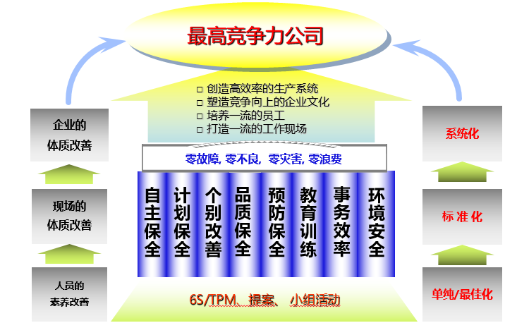 通過(guò)不斷循環(huán)的TPM八大支柱活動(dòng),持續(xù)的全員參與6S/TPM,提案和小組活動(dòng),把企業(yè)人員的素養(yǎng)提升到最佳化,把現(xiàn)場(chǎng)的體質(zhì)改善后要成為標(biāo)準(zhǔn)化持續(xù)管理,對(duì)企業(yè)的運(yùn)營(yíng)形成制度化和系統(tǒng)化,企業(yè)必定會(huì)成為行業(yè)最高競(jìng)爭(zhēng)力的公司。