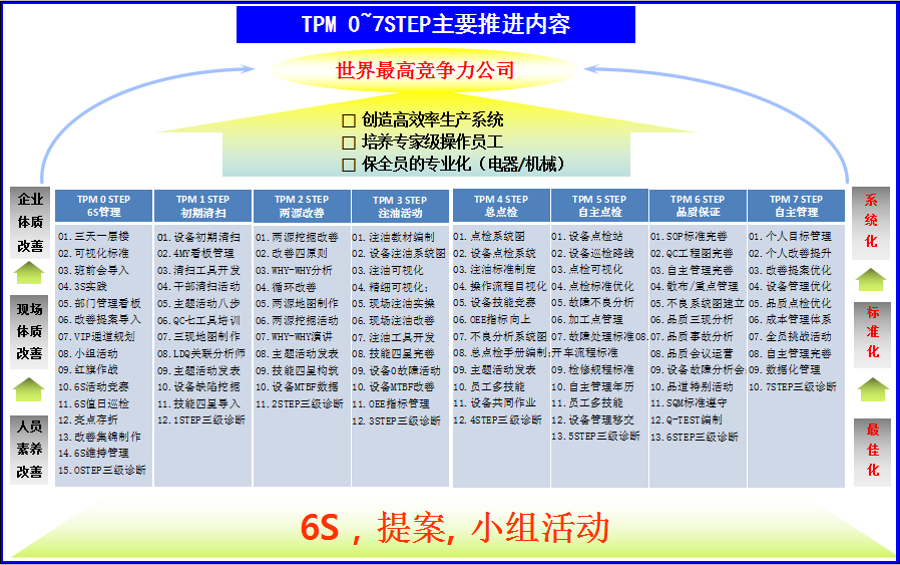 TPM 7 STEP是自主管理:通過(guò)持續(xù)的TPM各STEP的活動(dòng),員工綜合素養(yǎng)和能力達(dá)到最佳化,前期標(biāo)準(zhǔn)化內(nèi)容形成企業(yè)管理的制度,優(yōu)化各項(xiàng)管理的流程,確保成為行業(yè)最高競(jìng)爭(zhēng)力的公司。