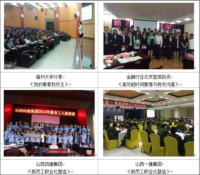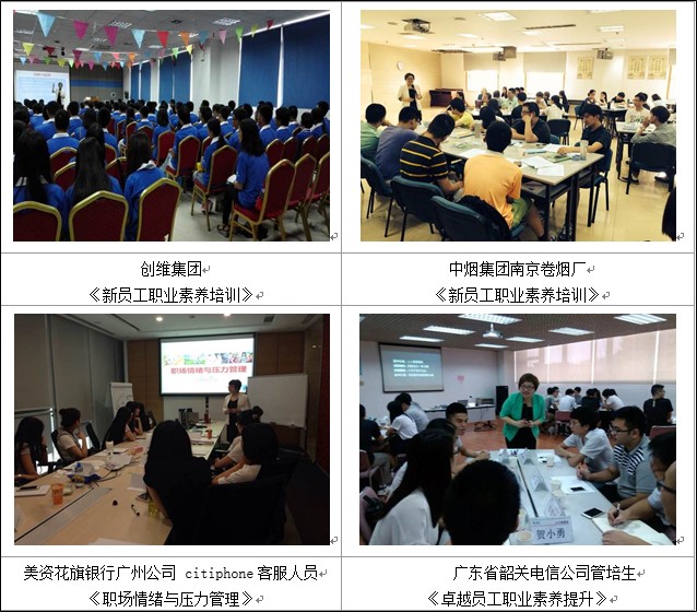 大型國有企業(yè):廣東省機(jī)場集團(tuán)、南京公路集團(tuán)、山西一建、山西四建、中電建,其中電建水環(huán)境公司采購老師《陽光心態(tài)與感恩工作》《人際溝通與交往藝術(shù)》課程30期,中國移動(dòng)《職場壓力與情緒管理》采購量100余天;